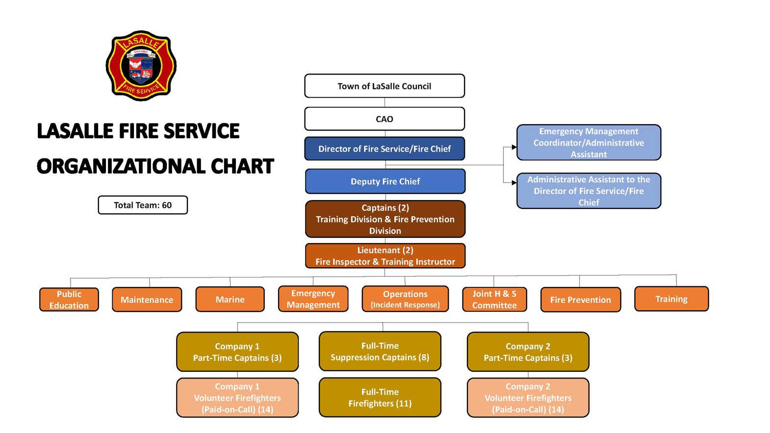 LaSalle Fire Service is a composite fire department, with 19 full-time firefighters and 34 volunteer (paid-on-call) firefighters. Our team works within 7 divisions including: